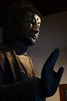 銅像。推古天皇、聖徳太子、蘇我馬子らが誓いを立てて発願し、609年に鞍作鳥(止利仏師)が造った日本最古の仏像。2度の火災に遭い、後補を受ける。